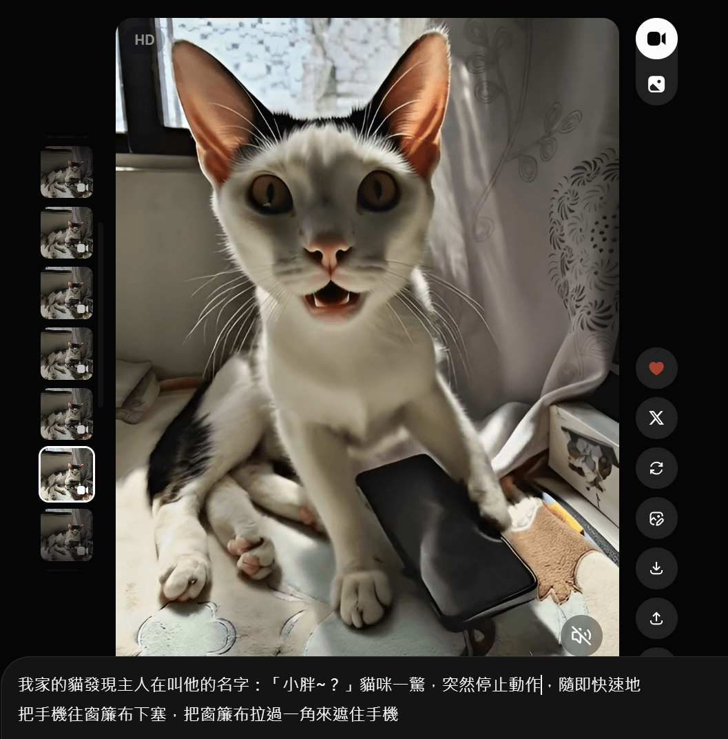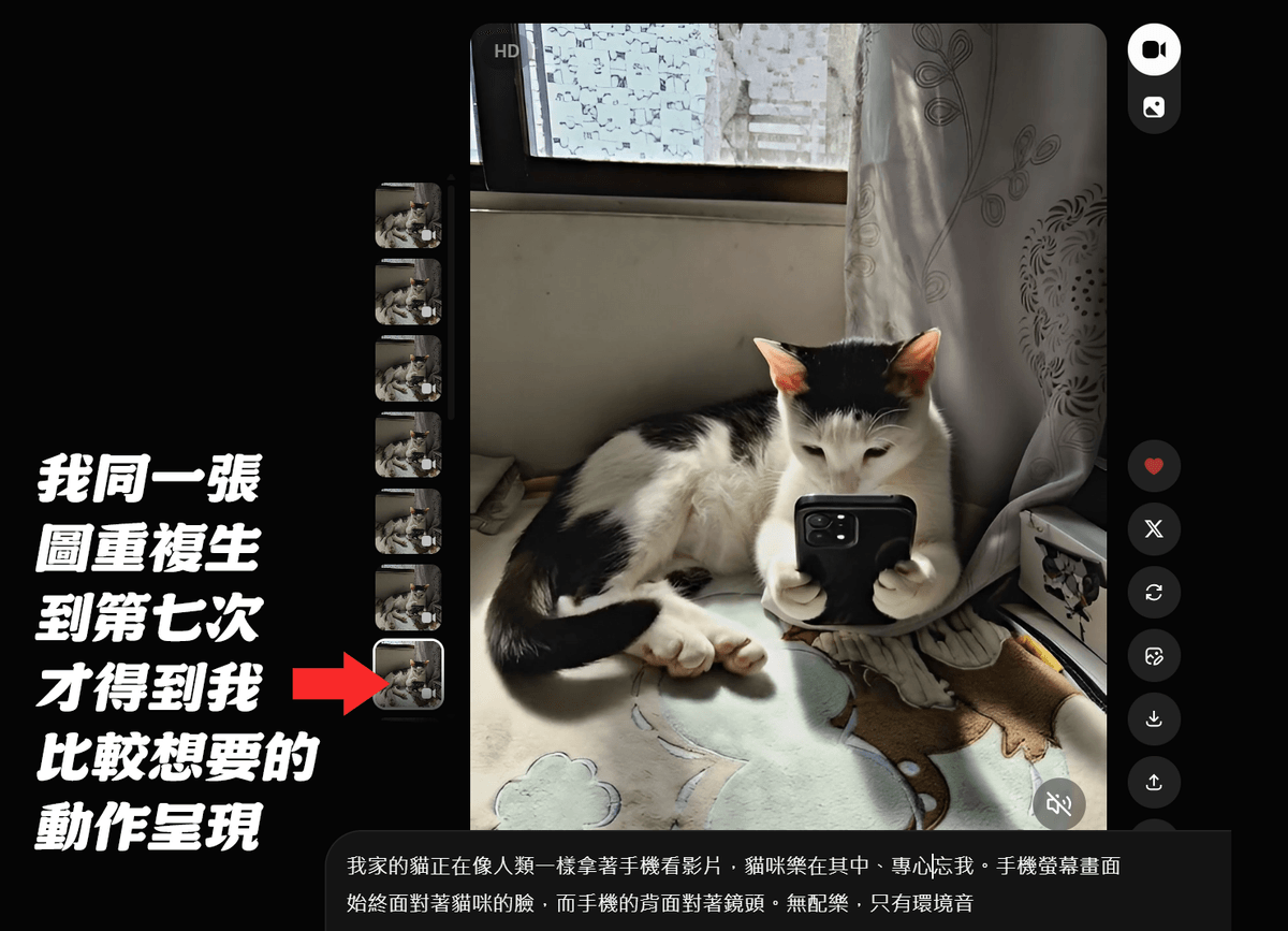 下面這一個畫面,是我將我家的貓照片上傳到Grok後,寫下提示詞 (指令/Prompt),然後Grok幫我生出的畫面。從圖片上我有標註,我同一張圖是重複生成影片,到了第七次生出來的片段,貓咪的動作與手上的手機的呈現方式,才是比較貼近我想要的樣子。也就是說,我前面六次一直花費算力,但是沒有得到我想要的。