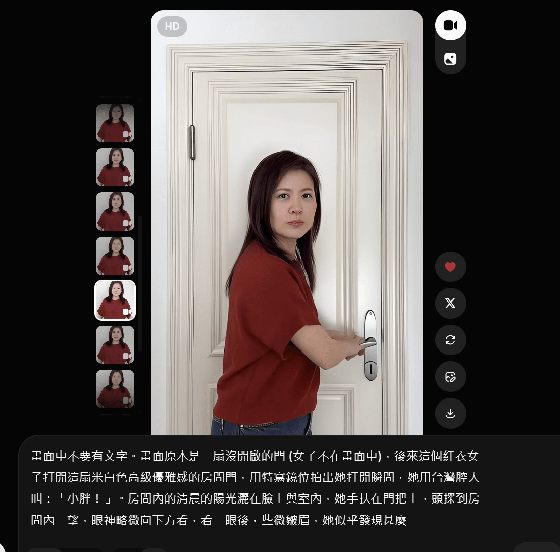 畫面中不要有文字。畫面原本是一扇沒開啟的門 (女子不在畫面中),後來這個紅衣女子打開這扇米白色高級優雅感的房間門,從外面推開到裡面,用特寫鏡位拍出她打開瞬間,她用台灣腔大叫:「小胖!」。房間內的清晨的陽光灑在臉上與室內,她手扶在門把上,頭探到房間內一望,眼神略微向下10度直視,看一眼後,些微皺眉,她似乎發現甚麼