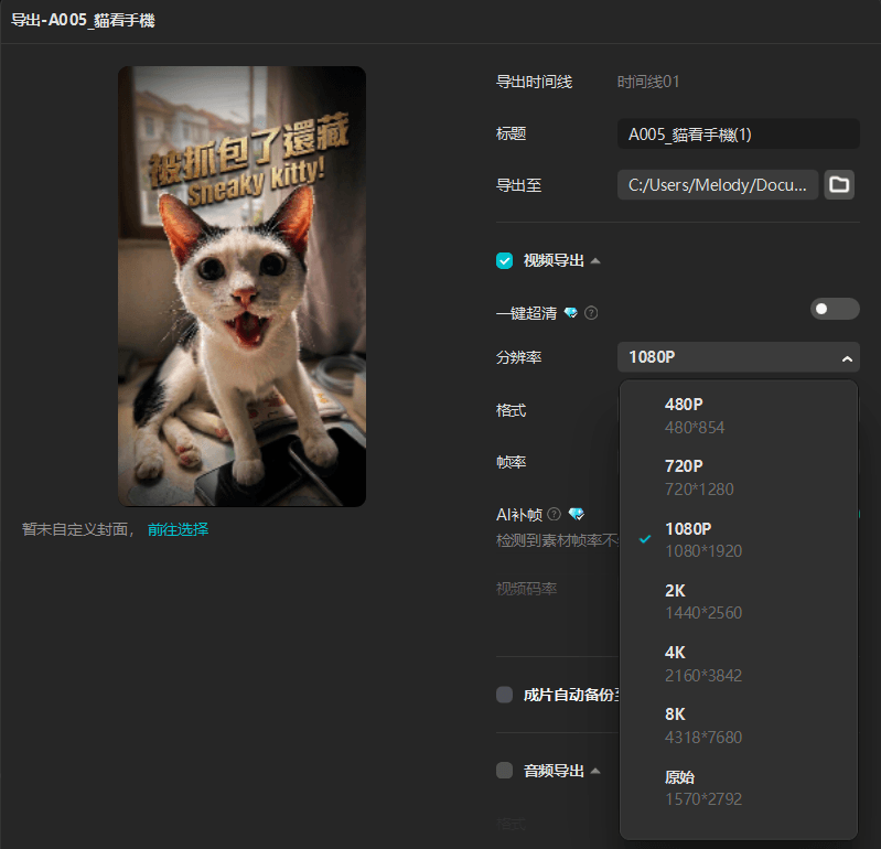 如果你覺得720P的畫質還是不夠,那接下來,進到剪映中串接影片畫面,在最後一段要「輸出影片」(導出) 時,選擇分辨率為1080P。