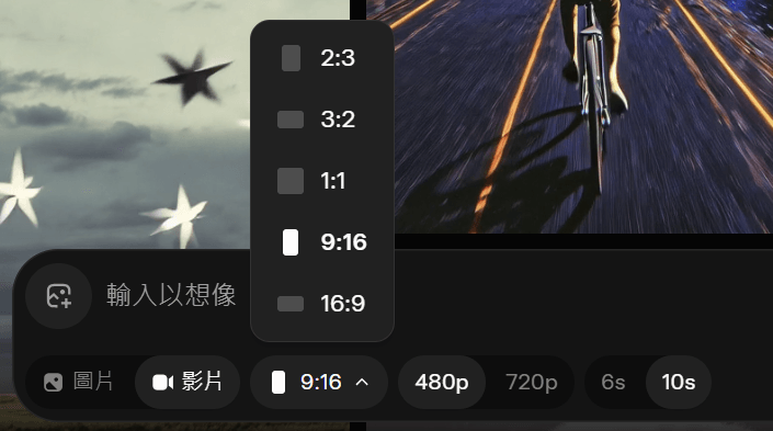 然後選擇生成「影片」,尺寸選「9:16」,畫素我選「480p」,影片長度「10秒」,你要選「6秒」也行。這邊解釋一下為什麼不選720p,因為畫素越高,則消耗的「算力」越多,如果你用免費版的話,沒生幾部影片,就不能再生了,這樣就要等隔天。同理,影片長度越長,消耗的算力也越多。
