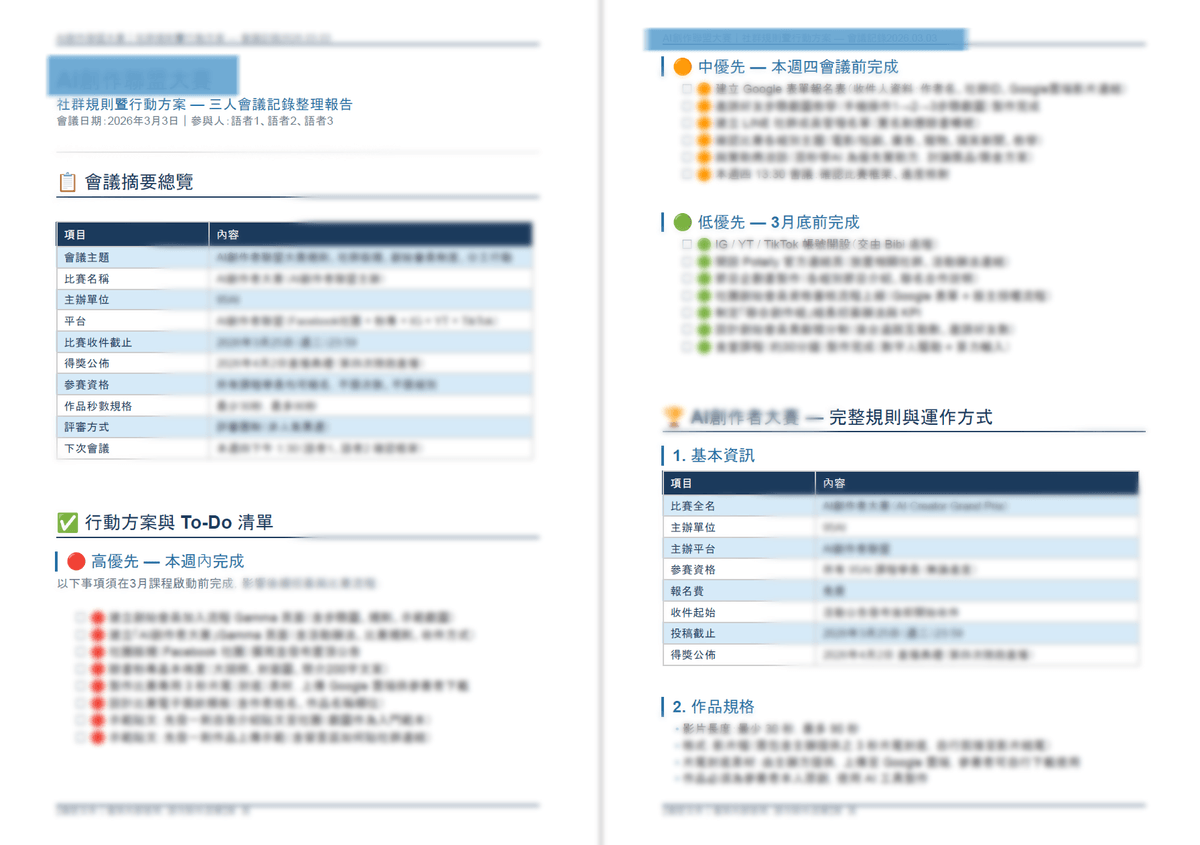 沒想到用AI這兩套工具後,竟然快速生成會議記錄,但更讓我驚訝的是,這份會議記錄實在太強悍,兼具美感,又有重點,更棒的還有行動方案,這樣開完會後,就知道哪些事情要Follow up,以及Check box方便我去勾選哪項行動我到底做了沒。