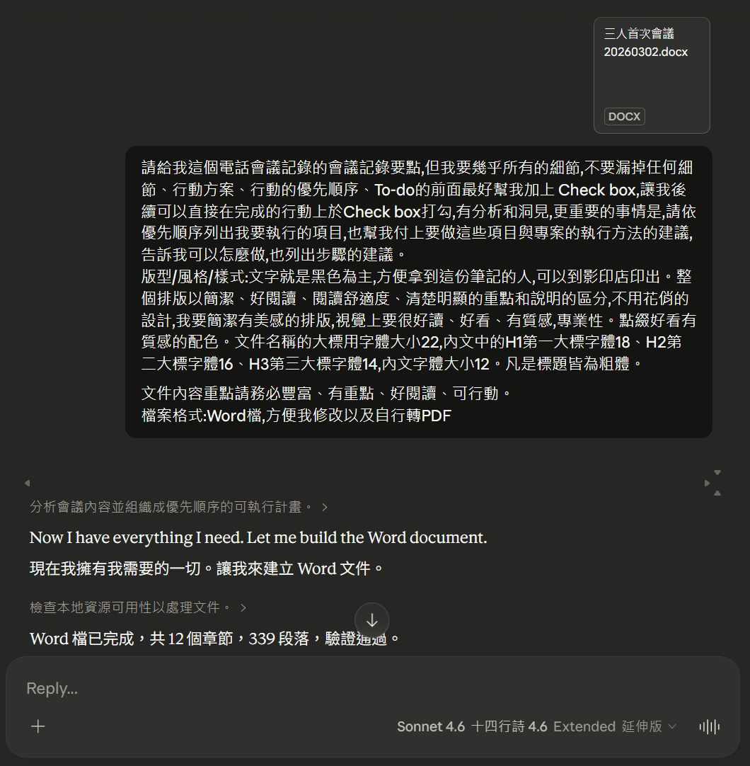 以上TurboScribe與Claude的介紹,我沒有和這兩個平台合作,單純因工作上開了兩三個小時的會議後,發現會議討論的東西太多,還好有錄音下來,但會議時間太長,按照我以往在開會後的會議記錄,可能要花幾個小時整理。