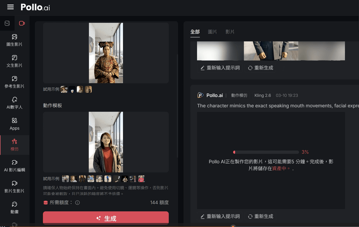 我不是直接用Kling AI平台來做,而是透過 Pollo.ai 平台中,選擇「模仿」(如畫面最左邊紅色的「模仿」),然後再選擇使用 Kling 2.6 模型,如上方畫面中,提供一張人物圖,以及「動作模板」上傳我在HeyGen生成的數字人影片後,再把提示詞填入,就可以生成慈禧太后跟你一模一樣的講話動作、表情和聲音。