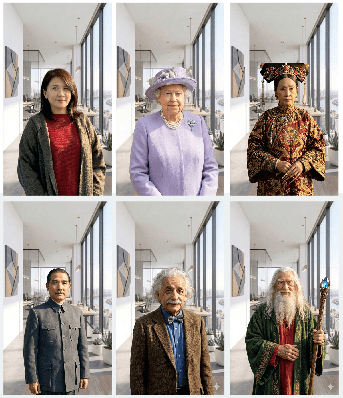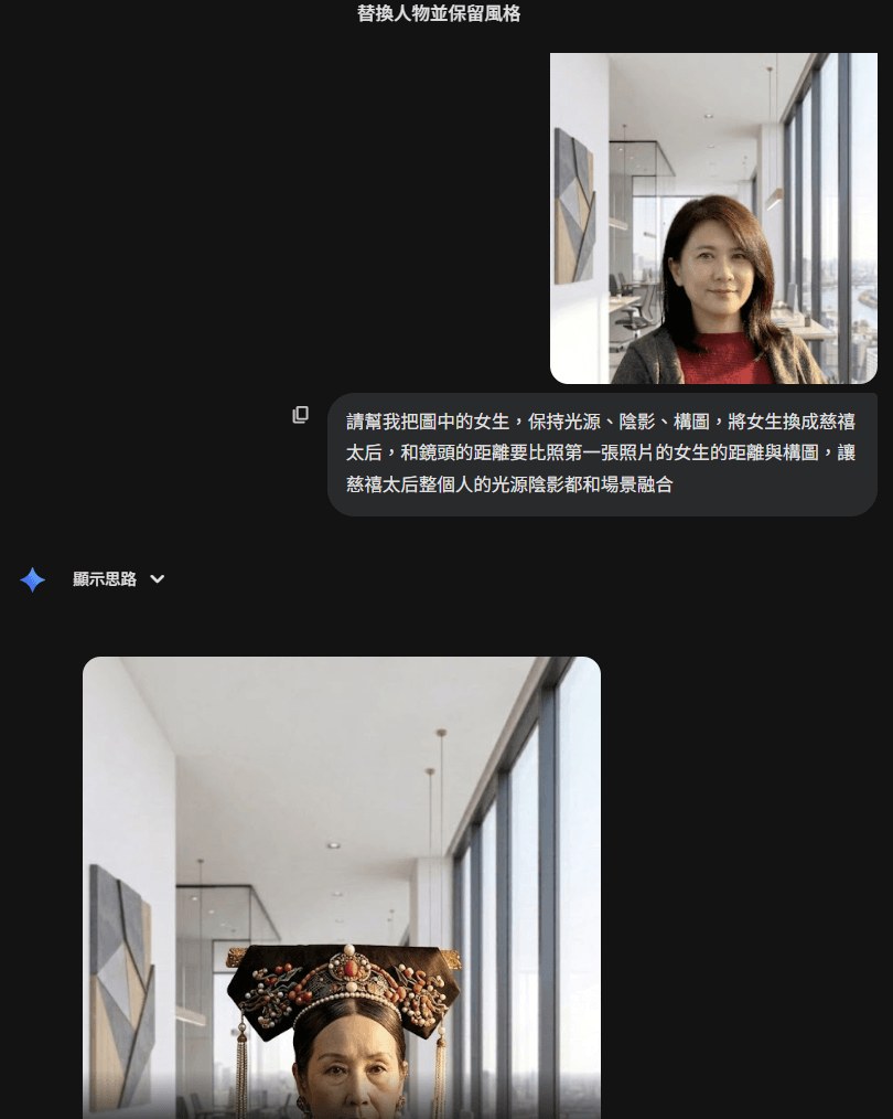 請幫我把圖中的女生,保持光源、陰影、構圖,將女生換成慈禧太后,和鏡頭的距離要比照第一張照片的女生的距離與構圖,讓慈禧太后整個人的光源陰影都和場景融合