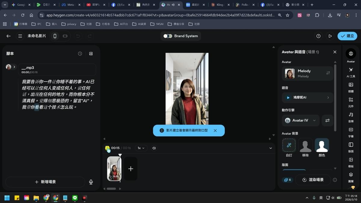 我用HeyGen數字人工具,把我透過Nano Banana做好的自己的人像丟到HeyGen裡去生成我的數字人,而講話的聲音則是我用手機錄音一段音檔,所以上面畫面中你看到音檔名稱:___.mp3,就是我錄音下來的內容,丟進HeyGen後他會自動判讀你語音內容。